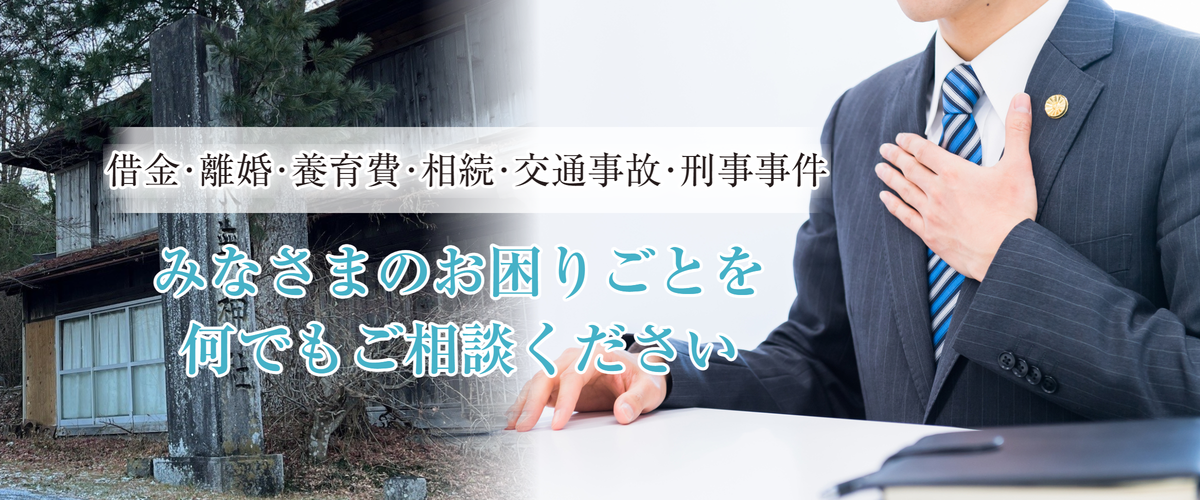 木曽福島駅から徒歩5分。木曽郡在住の弁護士が借金、債務整理、離婚、親権、養育費、相続、遺言、刑事事件、ハラスメント等、幅広い問題を解決へ導きます。法テラス制度が使えるため、収入に応じて無料でのご相談も可能です。